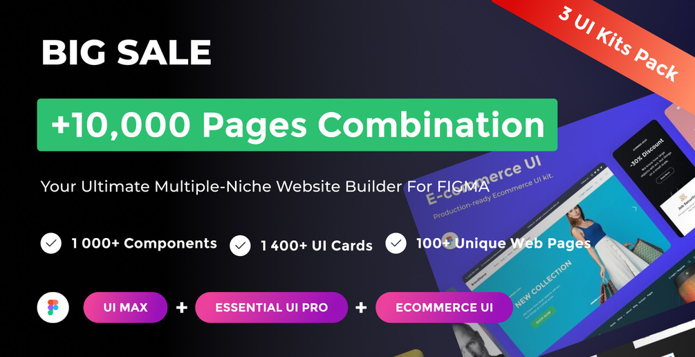 This bundle contains three Figma UI kits: Ui Max, Essential UI Pro, and E-commerce UI.