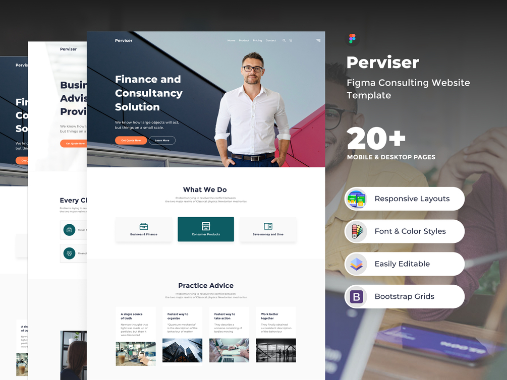 Perviser is a clean design and a fresh Figma template, made for consulting business. This beautiful Figma template comes with simple components and ui elements that you can fully customize to fit your needs. With the Figma consulting template, you have the ability to start designing a modern consulting business website easily.